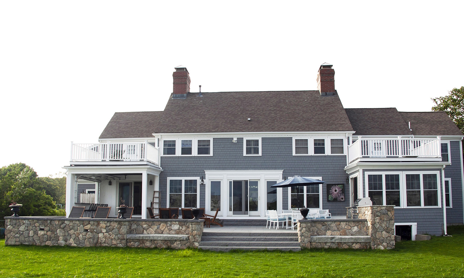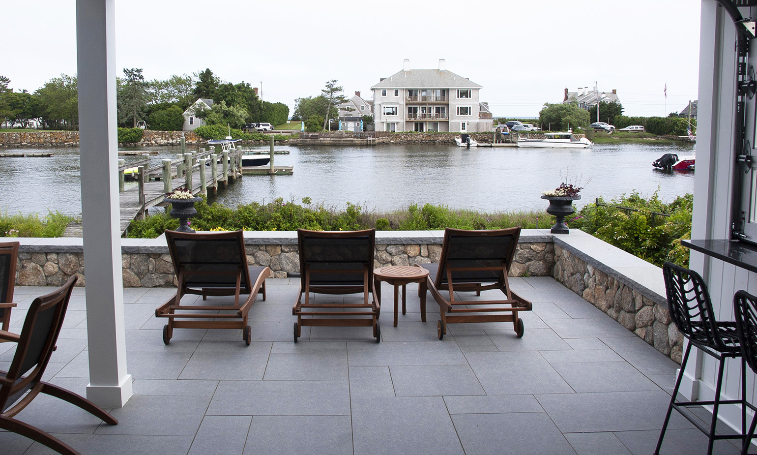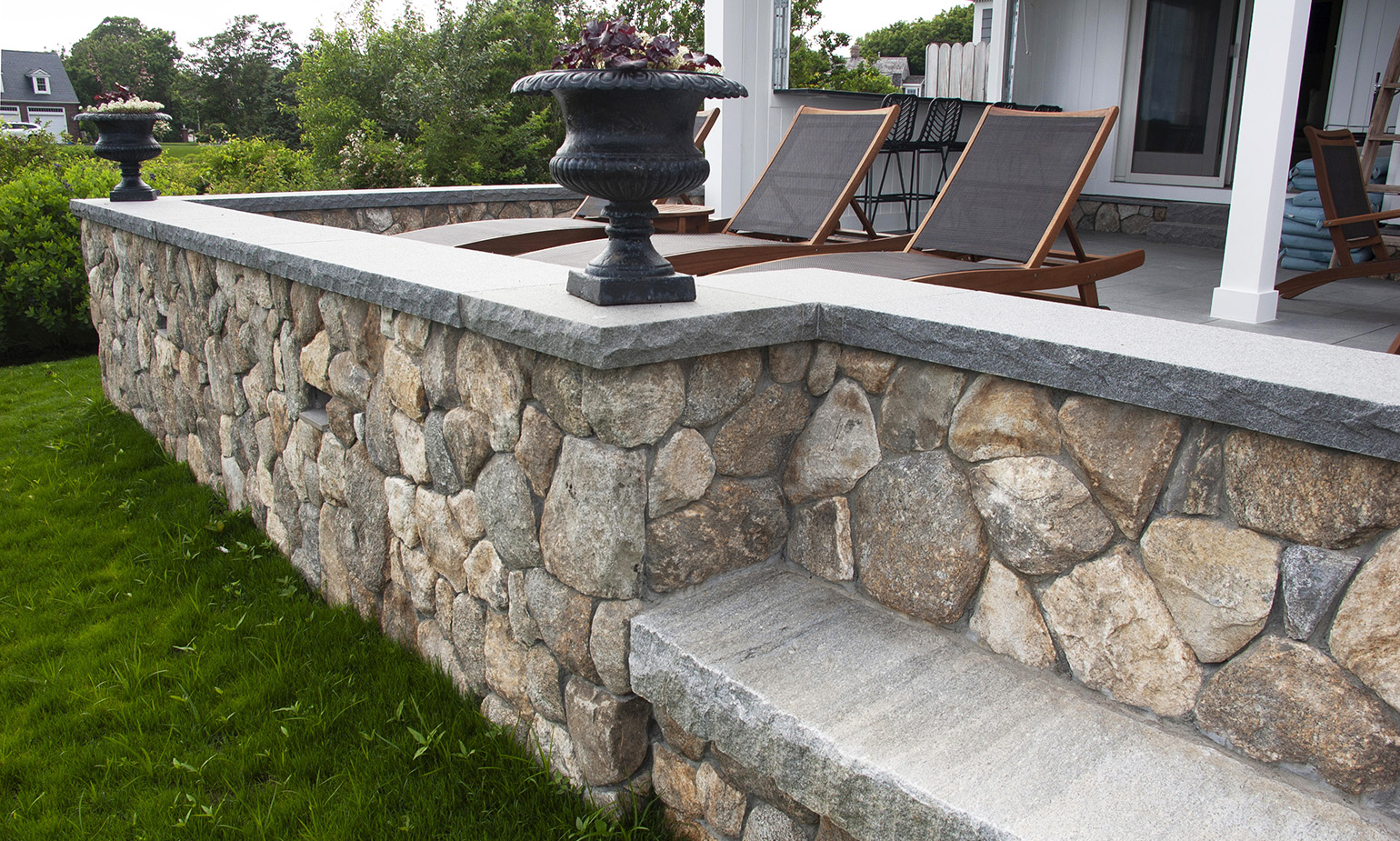 We rebuilt and expanded this outdoor patio which is the central gathering space looking out over the water for this large home. New fieldstone retaining walls with granite capstones provide seating for the patio and built in stone benches provide seating out to the game lawn. A built-in kitchen with broad counters allows the chef to remain part of the party. An enclosed sunroom was converted to an open, roofed bar area with sunset views down the coastline.