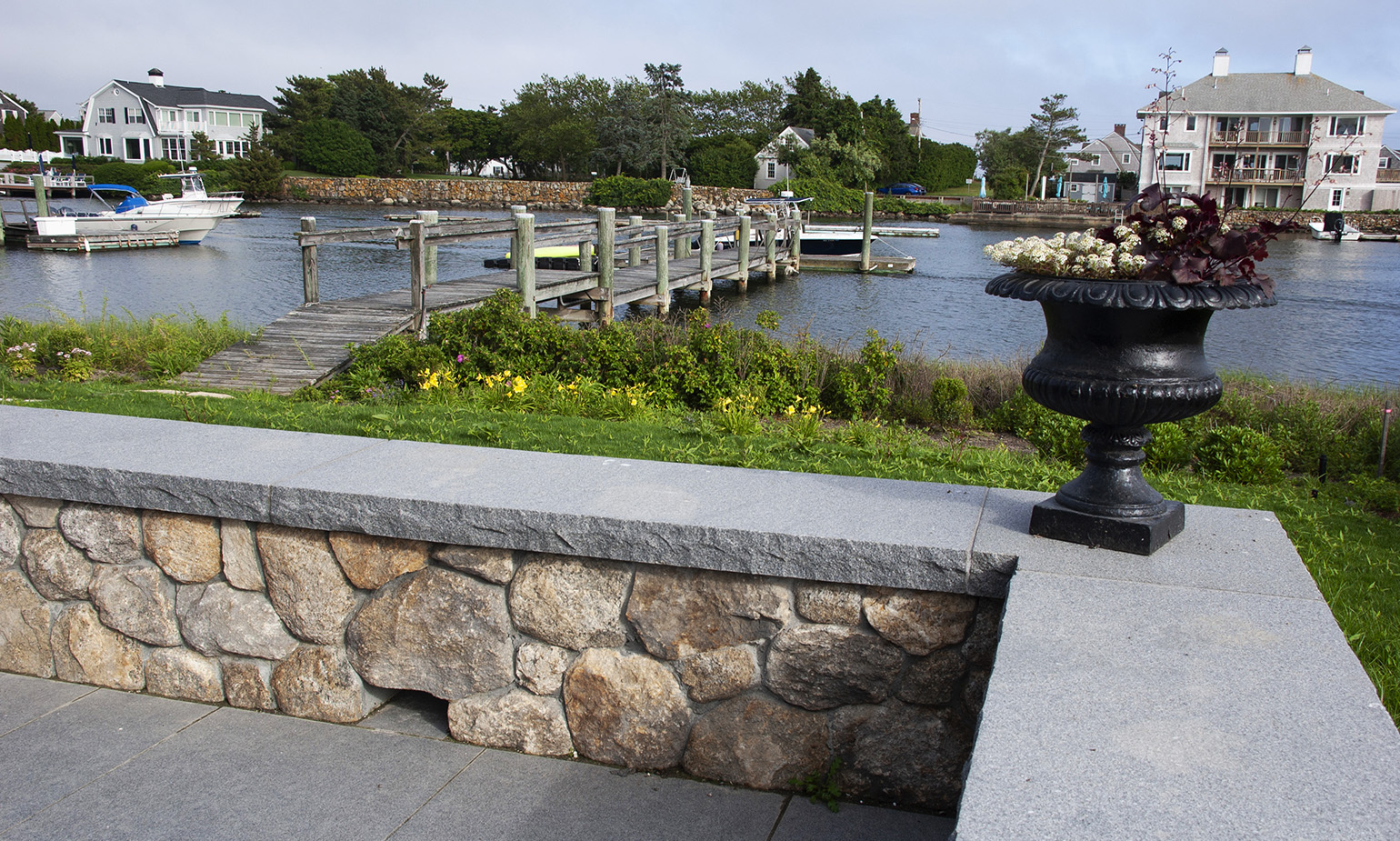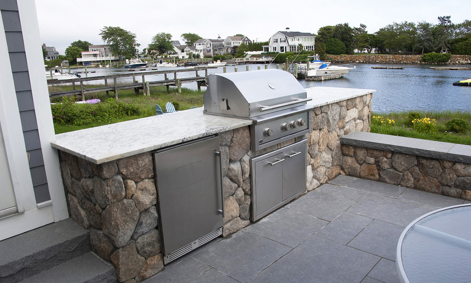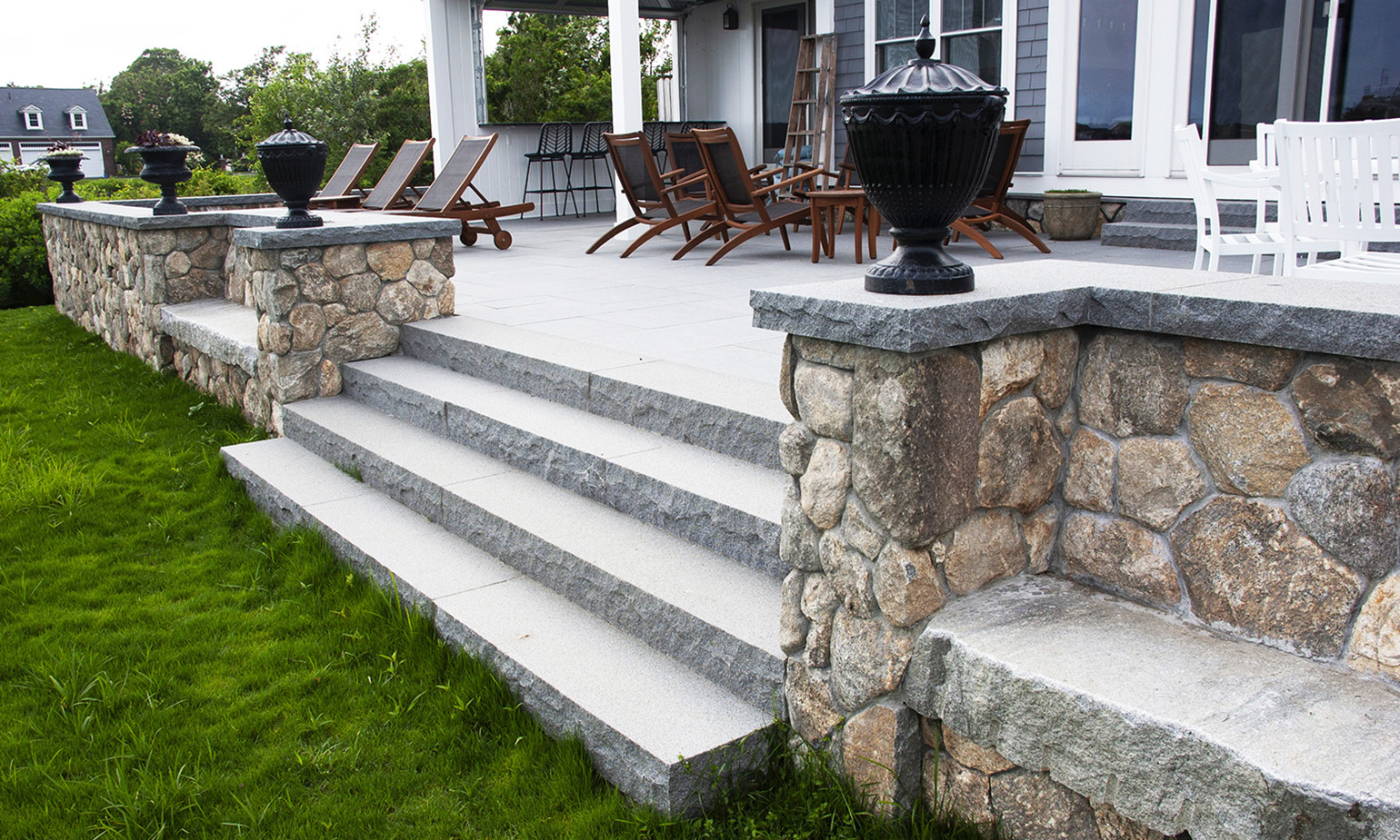 We rebuilt and expanded this outdoor patio which is the central gathering space looking out over the water for this large home. New fieldstone retaining walls with granite capstones provide seating for the patio and built in stone benches provide seating out to the game lawn. A built-in kitchen with broad counters allows the chef to remain part of the party. An enclosed sunroom was converted to an open, roofed bar area with sunset views down the coastline.