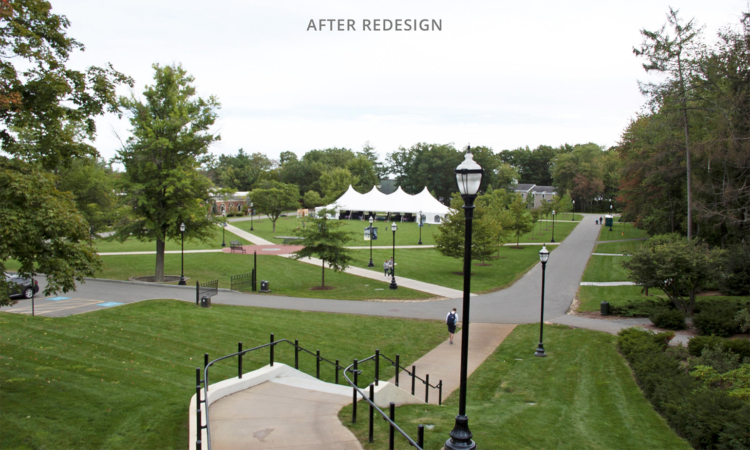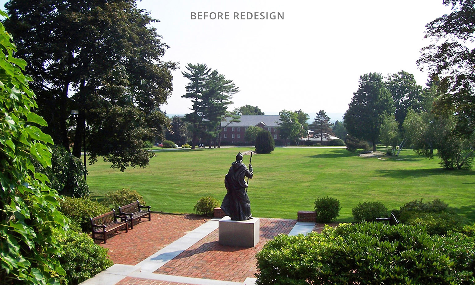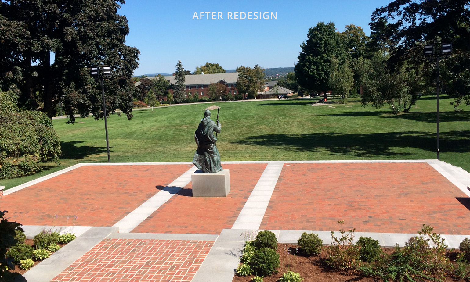 After leading the college through its first campus master planning process in 2006, Mr. Olmsted has been involved with implanting many improvements on campus including: expanding a small terrace used for their graduation ceremony into an expansive plaza with flexible seating and year-round use, turning a 300-car parking lot in the middle of campus into a new college green, building a woodland Grotto for the campus, and advising the college on strategic land acquisitions. Most recently we redesigned the main entrance onto campus with large walls and piers that frame the entrance down a tree lined drive.